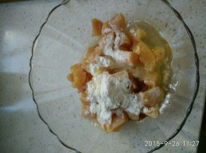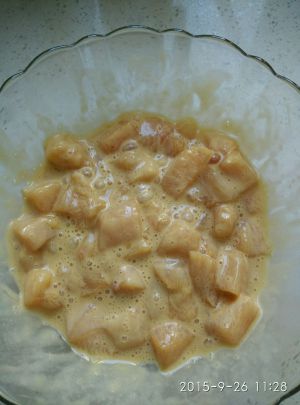 切好的鸡胸肉用少许酱油,料酒,盐,淀粉,一个蛋清拌匀