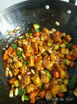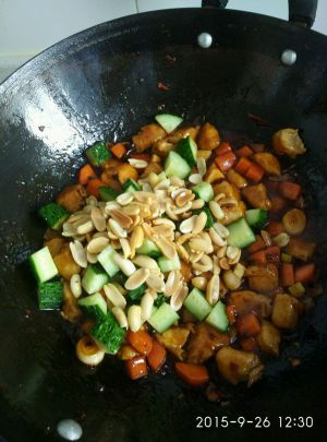 黄瓜,胡萝卜,鸡肉切丁。锅内热油放鸡肉翻炒(大约三分钟)变色后,放入胡萝卜丁翻炒(两分钟),再放黄瓜和炸好的花生米翻炒两分钟。最后放入事先调好的料汁。出锅即可~
