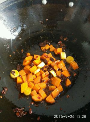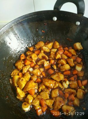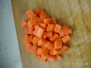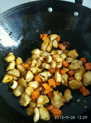 放入胡萝卜丁翻炒片刻后再倒入鸡丁翻炒均匀。