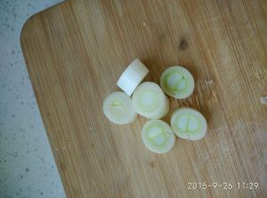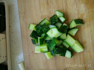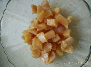 这个时候可以处理宫保鸡丁的食材。鸡胸肉切成丁,用料酒、盐、少量生粉抓均腌制;胡萝卜和黄瓜切成和鸡丁同样大小的丁;大葱切段。