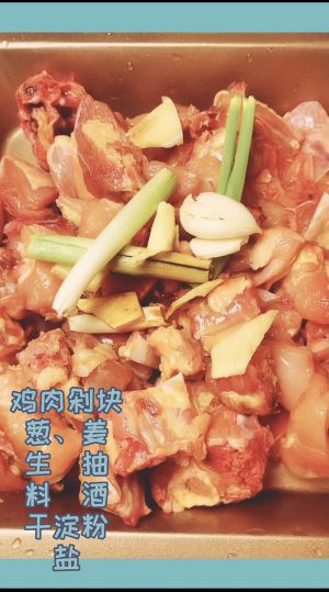 鸡肉剁小块,尽量做到大小均匀,放入料酒,老抽,盐,腌制半小时以上,时间越久越入味,入锅前加入淀粉,水,少许糖拌匀
