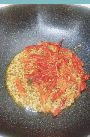 另起锅烧油,加入麻椒、干辣椒。
