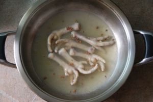锅里加清水,撒1小撮花椒,煮沸后入鸡爪。煮10分钟左右,关火。