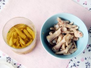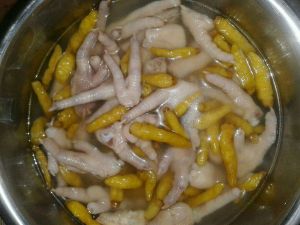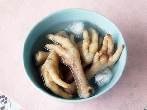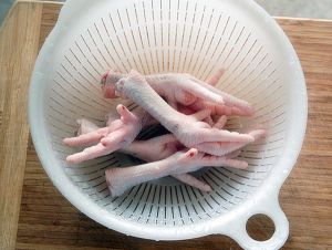 煮好的鸡爪捞起用凉开水冲净,入冰水里浸泡一会儿