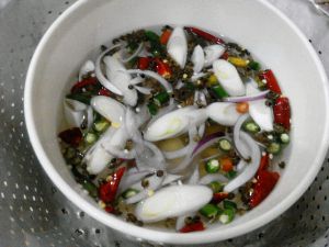 拿一个碗准备材料,一包泡椒,一勺花椒粒,把姜蒜切成片,把大葱切成段。 干辣椒,小米辣切成小段,洋葱切成条。放上盐