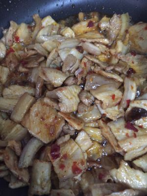 还剩两片姜,切粗丝,一起翻炒,炒到肉皮微微翘起。