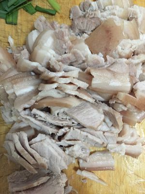 猪肉捞出洗净晾凉切片。切片大小因人而异,一般大一些比较过瘾。肉片切薄,但不要太薄,3毫米厚比较合适,太薄炒制后易过柴。