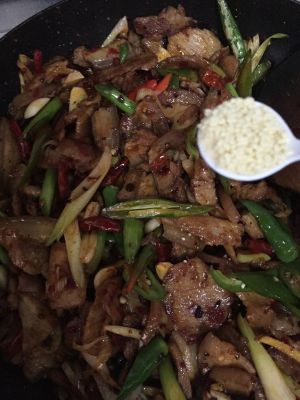 五花肉煸的有点干的时候倒入郫县豆瓣酱