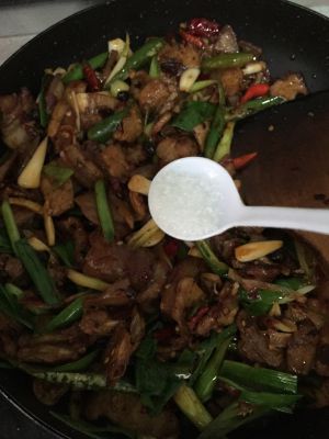 加入青蒜叶,糖,生抽,老抽,蚝油,翻炒到蒜叶略微变软后尝一尝味道,加盐调整后就出锅啦。