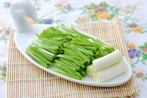 .将青蒜的白色部分先用刀拍一下,然后全部斜切成段备用