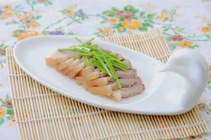 肉洗净放入锅中,加水,放入葱姜片,大料。料酒。煮30分钟。捞出切片。