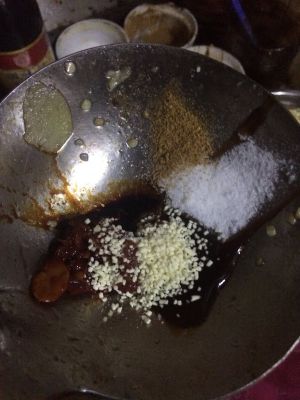 锅内放油加热,然后放入蒜,花椒爆香。再一勺豆瓣酱,炒香豆瓣酱。