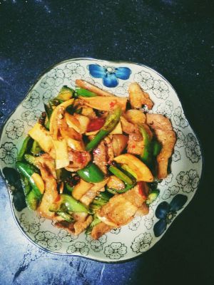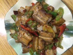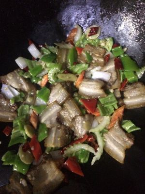 加入青椒翻炒(也可用蒜苗替代,变成蒜苗回锅肉),撒盐,起锅。