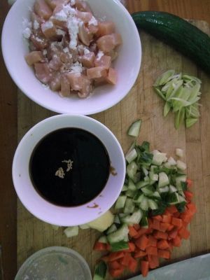 鸡胸肉切块用料酒淀粉抓匀,黄瓜、胡萝卜切丁,蒜苗切点,调汁(生抽一勺,醋两勺,糖三勺,耗油一勺,花椒油几滴,淀粉一点点,)