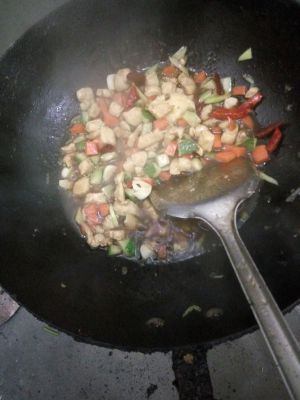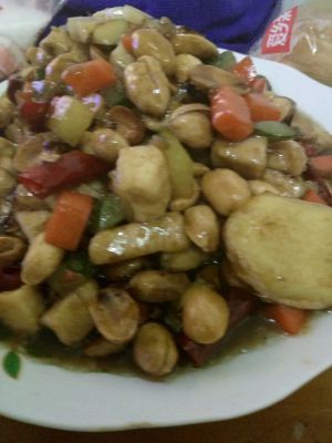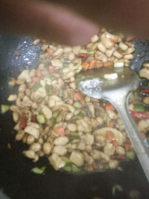 下之前炸好的鸡块不断翻炒(中高火),上色均匀后加各种调料(料酒少量,生抽酱油,糖,味精),最后加少量水淀粉,关火。我选择用了现成的熟花生,工序简单了不少。如果需要炸熟花生,建议小火炸花生至红衣脱落即可。