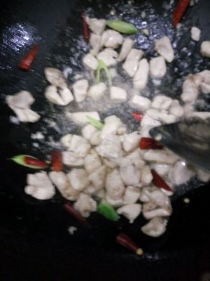 热锅凉油炒辣椒花椒,火不要太大辣椒容易糊,依次放入葱姜蒜,鸡丁炒开。加盐,糖,醋翻炒几下,加入淀粉水勾芡