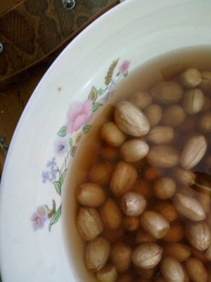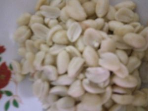 将花生用热水泡一下这样方便去皮 ,将去皮花生放入碗里用厨房纸吸干水放一边,