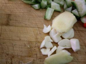 重新放1/4cup的油热锅,爆姜块,葱段(可放1,2片拍扁的大蒜),带香味出下一勺老干妈调味。