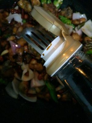 4、倒入炸好的鸡块翻炒均匀,加半勺料酒、1勺生抽、少许盐和糖调味,放入适量芹菜段炒至断生。