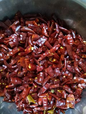 1、100g干辣椒冷水浸泡5分钟,捞出沥干水份。半只鸡切成3cm大小的块,加半勺料酒、少许五香粉、适量盐、葱花和姜丝拌匀,腌制20分钟。