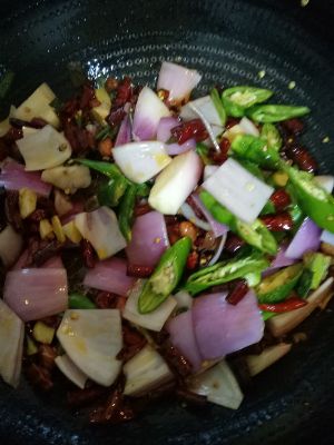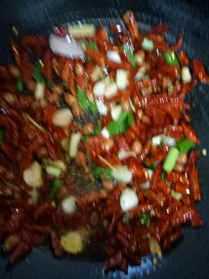 3.留底油,将姜丝和蒜瓣,花椒和麻椒,干辣椒爆香!闻到呛鼻味即可!