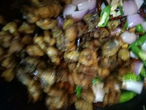 2.倒入油,到八成热的时候放入鸡块炸至呈深黄色,就是外表没有水份,颜色加深的时候即可捞出控油!