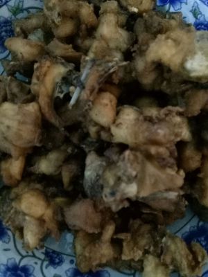 2、起锅倒入没过鸡块的油,烧至七分热(170度),下鸡块中火炸至金黄,捞出,控油。