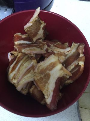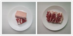 五花肉洗净,切成10cm长,0.5cm厚的大片