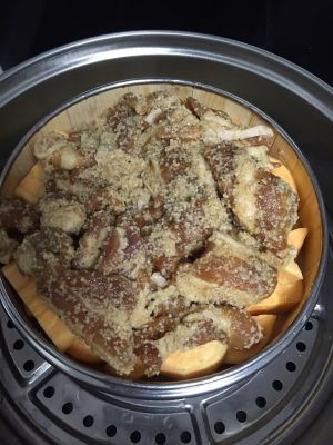 将红薯铺底,肉放在上面,用蒸锅蒸,其中这个蒸笼下面最好铺一层笼纸,大约20分钟出锅,撒上葱花即可……忘记拍最后成品了,下次做完再补吧,反正超好吃