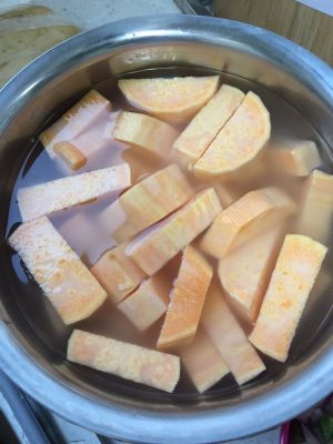1蒜姜切末,葱切末备用。五花肉切片。红薯切小块。