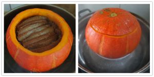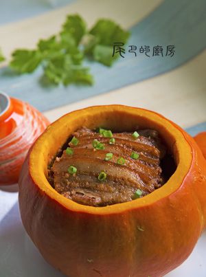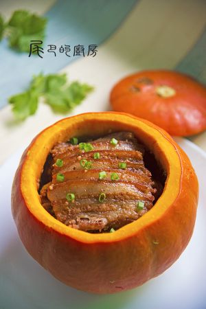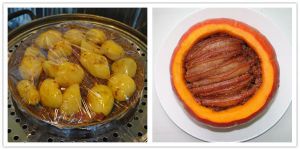 上笼蒸至软熟。将金瓜上部开盖、中间掏空,将蒸好的肉片反扣进金瓜内