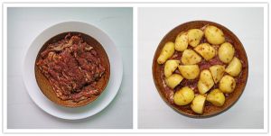 葱姜、花椒剁细,和其他调味料(米粉除外)放入容器中调拌均匀。加入肉片拌匀调料,加入米粉拌合。将肉片在蒸碗中摆成“一封书”形,再将打底的土豆加入调料容器中拌匀后摆在肉片上