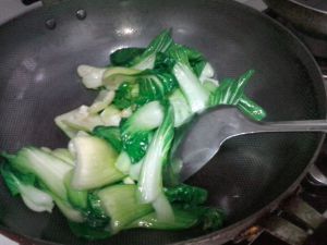 锅内入油,翻炒青菜(我买的是那种大头的青菜,没筋很容易熟,加一点点盐入个底味)