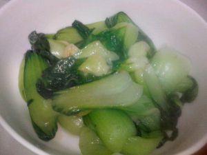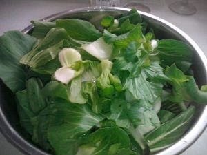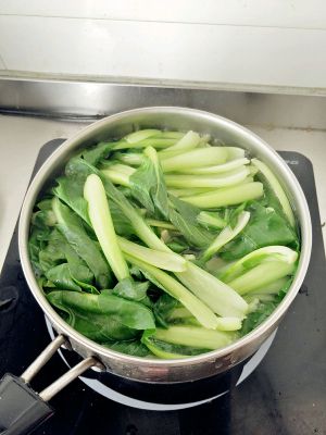 汤锅加水煮开,滴两滴油,少许盐,放入小青菜煮一分钟,捞出放盆底。