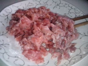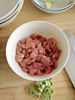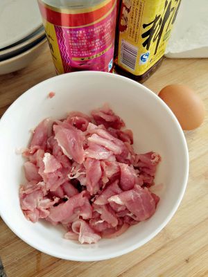 精瘦猪肉切片,放入豆粉,鸡蛋清。顺时针搅拌均匀,备用。