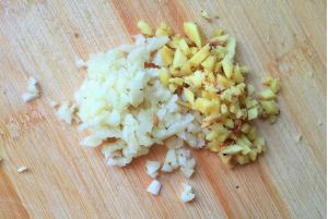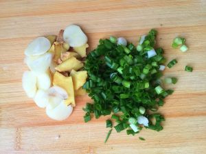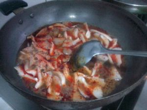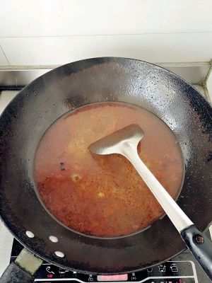 炒锅加热,热锅凉油,火开小,下生姜丝,酸末,葱花,炒香,下两勺豆瓣酱,切蒜骨朵大的一块红99火锅料。快速翻炒。