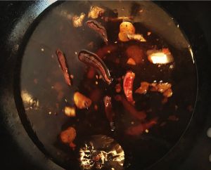 锅烧热,放入菜籽油烧辣,放入姜蒜片,干辣椒小米辣,豆瓣酱,爆炒出香味。