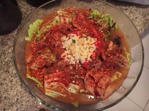在肉片上撒辣子面和少量盐,再放点葱花 熟油浇上就大功告成了。