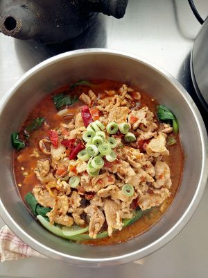 锅内添水,放入蘑菇加入好人家调料盖上盖煮3分钟,加入豆皮和木耳 再煮2分钟 盛入碗内,最后把肉片入锅煮2~3分钟,连肉带汤一起倒入碗内。