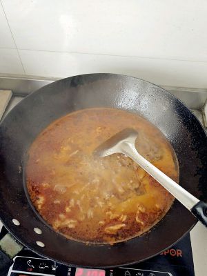 加1000ml冷水,同时加入老抽2勺 料酒2勺 青花椒10粒 胡椒5粒 盐3勺 鸡精1勺 等水烧开时,将肉片一块一块夹进锅里,煮15分钟。