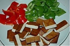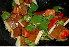 姜,蒜,(我这里为了再加点辣味,所以再加了几个干辣椒,)豆腐干切丝,青椒切菱形狀备用