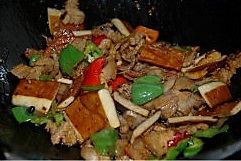 把锅中省下的油再次烧热,倒入青,红椒,香干翻炒至断生,加少许盐,倒入炒好的肉片翻炒。 加少许糖,鸡精,胡椒粉调味后起锅。