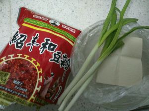 嫩豆腐一块,不是内酯豆腐,也不是老豆腐。一块钱到两块钱一块。放清水中泡一下,沥干水分,切成块,大概一半麻将牌的大小。准备豆瓣酱和大蒜苗或者小葱。
