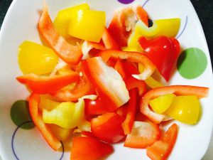 彩椒切丁备用。非常喜欢吃彩椒,所以买了两个,颜色配上也漂亮。