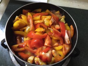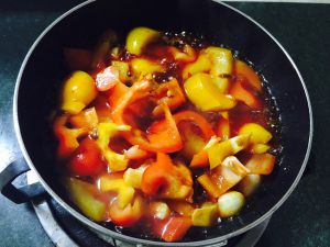倒入彩椒翻炒。