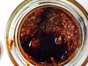 倒入豆瓣酱,平常喝汤的小瓷勺三勺可以,自己可以看心情添减,加一点酱油继续炒啊炒,注意别被溅出来的油烫着了。