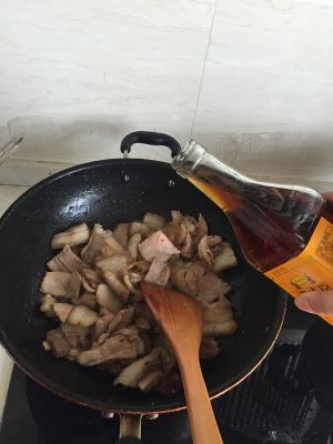 锅里倒入适量油,油烧热后猪肉下锅煸炒。