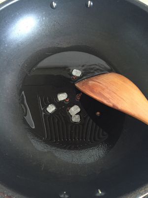 热锅冷油放入冰糖炒化,加入肉片翻炒几下。