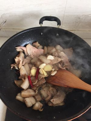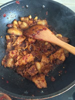 煸炒到肉片呈凹进去的造型,放入姜蒜 老抽 郫县豆瓣酱,一点点点糖,提味用。