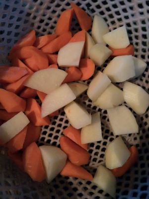 胡萝卜和土豆切块,牛肉切丁,加入生抽、陈醋、少许红酒腌制十分钟